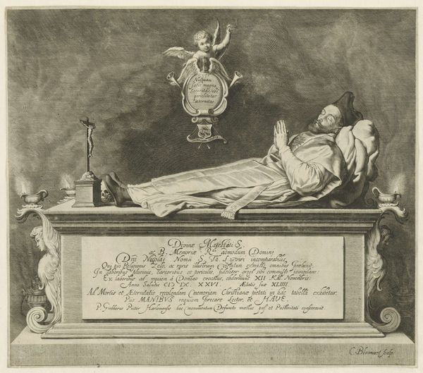 Jan Frederik Christiaan Reckleben created this print of the tomb of Johannes Polyander van Kerkhoven in the nineteenth century. The somber scene with its monochromatic palette evokes a feeling of reverence. The composition is structured around a strong horizontal axis formed by the tomb itself, which anchors the piece visually. Above, a dark, arched recess frames the scene, drawing the eye to the recumbent figure atop the tomb and the escutcheon above it. The figure's pose, reclining with head resting on hand, introduces a diagonal line that softens the otherwise rigid geometry. Reckleben’s use of engraving allows for meticulous detail, seen in the intricate folds of the figure’s drapery and the subtle gradations of shadow. This technique enhances the sense of depth and realism, inviting the viewer to contemplate themes of mortality and remembrance. The artist uses the semiotic language of funerary art to explore cultural attitudes toward death, inviting us to reconsider the visual and emotional codes embedded within such representations.