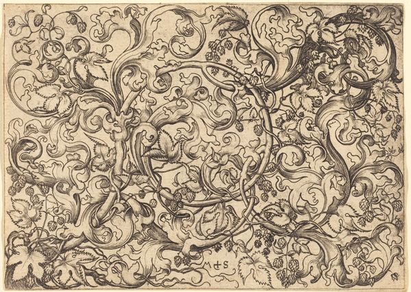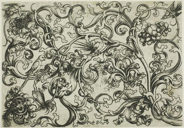 Israhel van Meckenem created this engraving of tendrils with birds sometime in the late 15th century. The image presents a decorative composition, typical of the Northern Renaissance style, where flora and fauna intertwine in intricate patterns. Van Meckenem made this print during the rise of the printing press, a groundbreaking moment in the history of media. Printmaking changed the way images and ideas circulated, helping to democratize art and knowledge in ways never seen before. These prints were not just artworks; they were a part of a larger shift toward a more visually literate society. Historical context is essential when we are looking at art like this. By consulting historical documents, such as inventories of print workshops and the records of art sales, we gain a much clearer idea of how art reflected and shaped the world of the past.