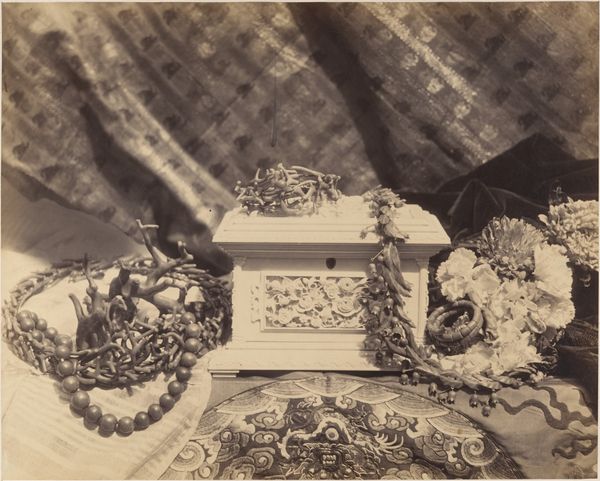 Editor: This is Thomas Mackinlay’s 1856 photograph, "Study for a Picture." It presents an arrangement of objects like musical instruments, ornate containers, and a helmet, captured through photography. The tonal range, somewhere between chocolate and coffee, seems intentional. How do you interpret the compositional structure of this image? Curator: Indeed, the tonal uniformity emphasizes the composition above all else. Note how Mackinlay contrasts textures: the soft drape of the cloth behind, set against the hard, reflective surfaces of the helmet and metalware. These contrasting elements play against one another to create depth within a relatively shallow space. This arrangement results in visual harmony through its play with dark and light and interplay of form and surface. Editor: So the contrast between those elements—the hardness, the softness—helps organize the piece and give it harmony? Curator: Precisely. Look at the mandolin. Its placement is no accident; its curves echo those of the helmet, unifying the objects through a shared visual language. Consider too, the direction of light. From where does it seem to originate, and how does it contribute to the picture’s effect? Editor: It’s coming from the upper left. The light really defines the edges of the objects, separating each item while also emphasizing its texture. Curator: It does. Now consider, what if the light source were to shift? What elements would then be emphasized? Editor: Hmm, interesting. The reflective qualities might change the entire visual balance. I focused initially on subject matter and mood, but you have illuminated the significance of light and texture in forming its aesthetic. Curator: To analyze form is to appreciate function. What starts as art becomes craft.