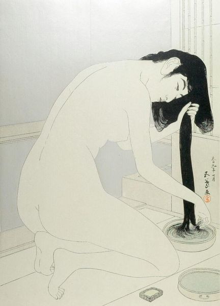 Curator: Hashiguchi Goyo’s print, “Woman Filling Basin at the Sink,” depicts a woman in a private moment of ablution. There is a sense of calm, and perhaps a hint of vulnerability. Editor: The process of woodblock printing here strikes me. The flattening of space alongside the very careful registration of colors must have required immense skill. Curator: Absolutely, and the posture… the bowing of her head and body speaks to a cultural encoding of feminine modesty and grace. It's an enduring image, tapping into archetypes of purity and domesticity. Editor: I’m more curious about the materials. What inks were available? How did the quality of the paper affect the final image, and how did labor practices impact its distribution? Curator: Those details offer valuable context. Yet, the symbolic weight of the bathing woman transcends the specifics of its production. It’s a reflection of cultural ideals surrounding womanhood. Editor: Perhaps. But understanding the materiality and production allows us to deconstruct those ideals, seeing the art not just as a reflection, but also as a product of its social conditions. Curator: A powerful point, and one that offers a richer understanding of how visual symbols acquire meaning over time. Editor: Indeed. When we consider art's grounding in its material world, we expand our appreciation of its social role.