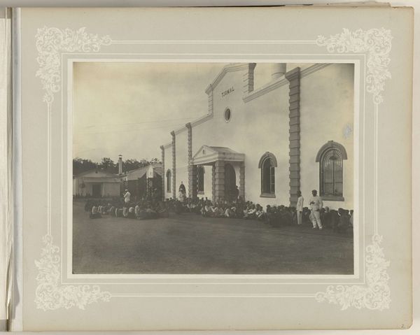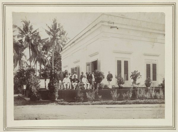 Curator: Welcome to the Rijksmuseum. Before us is an albumen print by Kassian Céphas, entitled "School met kinderen," or "School with Children," created in 1886. Editor: It strikes me as a rather staged image, yet there's something genuinely captivating about its stark composition. The muted tones and the way the children are uniformly dressed lend it a sense of ordered discipline. Curator: Céphas worked extensively for the Sultanate of Yogyakarta, documenting its people and landscapes, becoming a pioneer of photography in Indonesia. This work can be seen as ethnographic documentation, capturing a moment in the colonial education system. The role of photography in shaping perceptions and power dynamics within the Dutch East Indies is also key. Editor: Yes, and when considering the materiality of the albumen print itself, there’s a beautiful layered texture visible. The process demanded skilled manipulation of light and chemistry. Note the way Céphas framed the scene—the choice of vegetation in the foreground, the structure of the school building—it adds layers of visual complexity that elevate the picture beyond a simple record. We see the landscape as co-creator. Curator: Exactly. And this interplay reminds us of how colonial power structures sought to not just control, but to create an ideal environment, reflected in institutions such as schools. Consider who had access to this image and what narratives it helped construct. Editor: It raises questions about the representation of childhood and labor within colonial contexts, certainly. The creation and consumption of these images reveal complex socio-economic realities. How does the photographer fit in? Curator: Photography in the 19th century served a crucial function in documenting and showcasing colonial efforts. These images reinforced narratives of progress and civilization, justifying foreign influence. Editor: Looking closely at the print’s surface, I am aware that it is the result of a complex layering and process, involving many skilled hands. So it provides insight, then, into a very specific technological and artistic network. Curator: A complex network deeply rooted in the era’s politics. Examining art through this lens reveals its broader socio-political role and effect on society. Editor: Ultimately, it underscores how inextricably intertwined art, material, labor, and context were and continue to be. It leaves me questioning, "what is truly revealed through this depiction?" Curator: An excellent question to carry with you as you continue through the collection.
