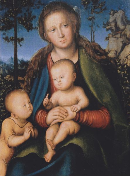 Curator: Today, we’re observing Pietro Perugino’s oil on wood panel, "Madonna with Child," painted around 1500, residing here at the Detroit Institute of Arts. Editor: Immediately, I’m struck by the painting's serene yet somewhat melancholic aura. The symmetry is meticulously arranged, but there's a certain emotional detachment. Curator: Indeed, the symmetrical composition creates a stable and harmonious visual structure. Note how Perugino uses linear perspective to guide the eye through the landscape behind the figures. It adheres quite strictly to the renaissance era compositional techniques. Editor: The Madonna’s gaze is intensely focused, yet feels strangely vacant. This directs attention, but it also adds to that feeling of sadness or contemplation. The positioning of the child, and her embrace, communicates protection and strength but at a remove. Is that a tiny halo or just my imagination? Curator: You're correct; there are very faint halos. We also need to think about the clothing which has significant visual function. Her red dress, a potent symbol for passion and sacrifice, and the deep blue cloak could reference her status, and her faithfulness. Editor: Absolutely. Blue is traditionally linked with the Virgin Mary, and the dark, muted shade hints at an inner suffering or awareness of Christ’s fate, the background is muted as well, almost disappearing behind them and casting them into a stark, confrontational illumination. Curator: The very calculated brushwork, smooth and even, with hardly any visible texture adds to its symbolic interpretation. It's not about raw emotion, it's more elevated. Every line is very cleanly applied and separated. Editor: Perhaps we're meant to focus more on the iconic significance rather than any tangible emotion from the pair, it makes me consider the ways artists portray motherhood and suffering throughout history. Curator: Absolutely. A masterfully controlled use of form and content to render its deeper significance. Editor: It invites introspection, about faith, maternal duty, and what these figures represent beyond the personal and the familial.