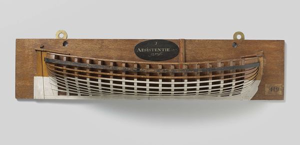 Editor: This is the "Half Model of a 68-Gun Ship of the Line," dating from around 1797 or 1798. It's made of wood and strikes me as incredibly detailed and precise. What do you see when you look at this piece? Curator: What I find compelling is how this object straddles the line between art, engineering, and imperial power. This isn't just a decorative object; it's a tool, a plan made manifest. Consider the late 18th century—maritime power was directly linked to colonial expansion, to the brutal realities of the transatlantic slave trade, and to wars waged for resources and dominance. Doesn't this model, with all its intricate detail, represent the machinery of that power? Editor: That's a darker interpretation than I had initially considered. I was mostly thinking about the craftsmanship involved. Curator: Absolutely, the craftsmanship is undeniable! But we can’t separate that skill from the purposes it served. This ship, once built, would have been a weapon, a tool of commerce, and a symbol of national ambition. Think about the people whose lives would be impacted by its voyages - the enslaved, the indigenous populations, the sailors themselves. This model becomes a potent symbol of the intertwined narratives of progress and oppression. What do you think about its silence? Editor: Silence? Curator: Yes, the object doesn't *tell* you about the violence, displacement, or labor that makes it exist; those narratives are erased from its surface. In what ways do you believe those issues shape our perception of the piece, despite not being obviously represented in the model itself? Editor: I see your point. It does make me think about whose stories are told and whose are left out of history. Thanks, that's given me a lot to consider. Curator: And for me as well; looking closer at this model reminds me to challenge what it represents in my mind.