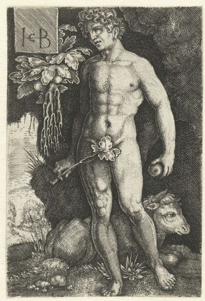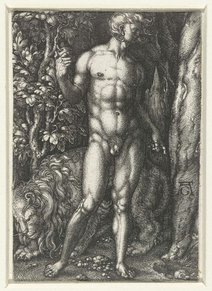 Johann Ladenspelder made this engraving of Adam, sometime in the mid-16th century. It's made using a printmaking process that involves cutting lines into a metal plate, inking the plate, and then transferring the image onto paper. The visual impact comes from the contrast between the fine lines and the stark white of the paper. Look closely, and you'll notice how Ladenspelder varies the density and direction of the lines to create a sense of volume and texture. The engraving technique itself has social significance. It emerged in the context of the printing revolution, enabling the mass production of images. This had a democratizing effect, making art more accessible to a wider audience, but also transforming artists into skilled workers within a capitalist system. The intense labor of meticulously engraving each line reflects the changing dynamics of art production during the Renaissance. Ultimately, understanding the processes and materials behind this print helps us see it as more than just an image; it’s a product of its time, shaped by technological advancements and shifting social structures.