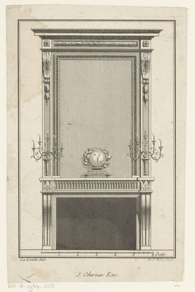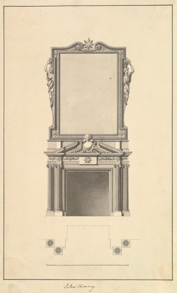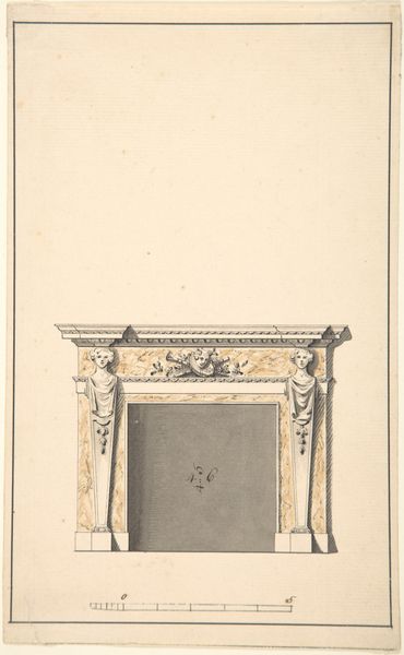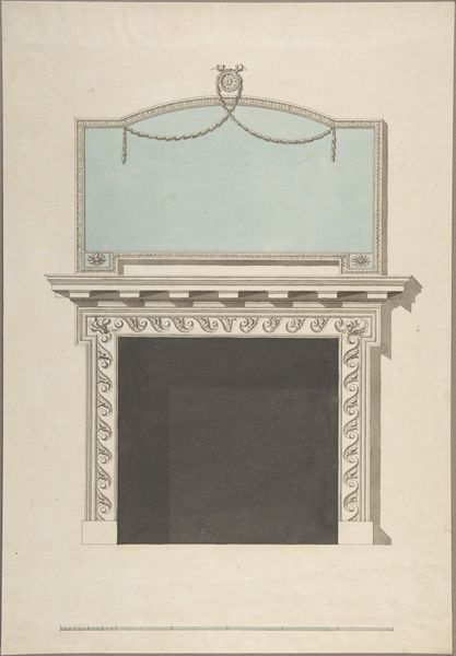 Curator: Standing here, we're observing John Yenn's "Design for a Chimneypiece," a drawing and print made sometime between 1770 and 1821, currently held at the Metropolitan Museum of Art. It's a fascinating piece within the Neoclassical movement. Editor: It certainly has a severe, ordered elegance, almost sterile. The light pink backdrop only barely softens the rigid geometry of the chimney and the oval frame above. Curator: Indeed. Neoclassicism was, in many ways, about order after the perceived excesses of the Rococo period. Yenn’s design speaks to that desire for rational design, evoking ancient Greek and Roman ideals about form. How do you see the artist exploring materials in this design? Editor: The artist’s medium is essentially line. It describes shape and texture, but I'm more drawn to the potential of the absent materials. This piece feels like a call for marble and carefully carved wood. Look at how those precise pencil strokes indicate texture and ornament. One must think about the labor involved in rendering this at full scale with proper material. Curator: Absolutely, there's a strong emphasis on craftsmanship that aligns with Neoclassical ideals. The level of detail in the fluting of the pilasters and the delicate wreaths is quite striking. This type of imagery became symbolic of social status and refinement. Do you think this design catered to a specific audience? Editor: Without a doubt, it projects power and sophistication, it would have certainly appealed to wealthy patrons seeking to express their refinement and learning. The emphasis on balance and proportion speaks volumes about the priorities of its commissioner. This elevation showcases a carefully planned interior scheme that privileged geometric order, where function appears second to an overall harmony and a certain cold beauty. Curator: Very well said. This piece really exemplifies the role art can play in defining social narratives. Editor: It certainly highlights the way a well-placed chimney could fuel the construction of new societal roles. Curator: It certainly is a drawing that invites us to appreciate not only design, but also its potential role within a certain moment in history. Editor: Exactly, reflecting on what’s physically there versus what we project onto it reveals quite a bit about the power dynamics inherent in material culture.