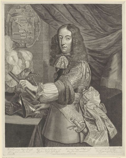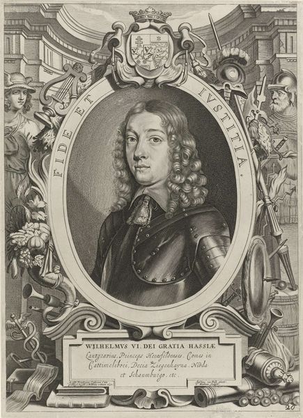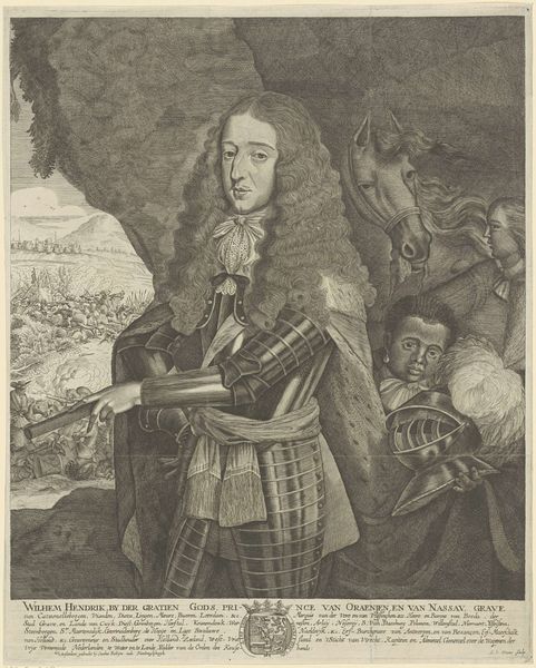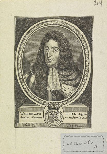 Here we see a portrait of William III, Prince of Orange, rendered through engraving. The prince is clad in armor, a sword in his hand, symbols traditionally associated with leadership, protection, and martial prowess. Consider how the image of a leader with a sword evokes ancient heroes and gods, such as Mars, the Roman god of war. This association connects William III to a long lineage of powerful figures, imbuing him with an aura of invincibility and authority. The armor itself speaks of readiness and defense, reflecting the prince's role as a protector of his people. Yet, these symbols have been used to justify violence and oppression. The sword, initially a symbol of defense, can easily become an instrument of aggression. The presence of these symbols here points to the cyclical nature of history, where symbols resurface, evolve, and acquire new meanings in different contexts. It’s a reflection of our collective memory and its subconscious impact on the production and interpretation of such imagery, creating a powerful, deeply engaging visual experience.