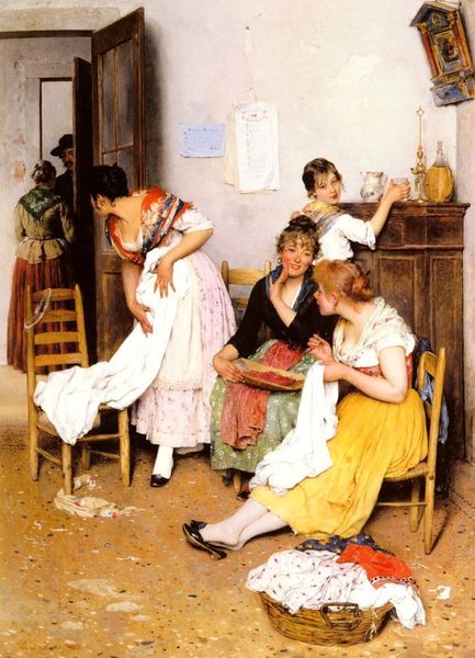 Editor: This is John Constable’s painting, “Ladies From The Family Of Mr William Mason Of Colchester,” an oil painting of what appears to be a domestic scene. There's a quietness, almost a melancholy, in the way the figures are arranged. What social dynamics might Constable be highlighting? Curator: That's a perceptive starting point. The painting offers us a glimpse into the lives of women within a specific socio-economic context of early 19th century England. Notice how they're positioned within the interior – the figure by the window seems to be gazing outwards. Does that separation speak to the constraints placed on women of this era? Editor: It could suggest a sense of longing, or even confinement within the domestic sphere? But then what about the women in the center reading or knitting? Is that meant to signify their role and duty? Curator: Exactly. Knitting and reading were activities often prescribed and valued, weren’t they? They reinforced a particular notion of femininity that emphasized domesticity and intellectual pursuits deemed suitable for women. Yet, I wonder how these depictions reflect the realities of women in that era and how women were involved in broader cultural conversations through needlework and written texts. Editor: It's interesting to think about how gender, class, and domestic life intersect. Constable wasn't just painting portraits, but providing social commentary through those familiar themes. Curator: Precisely. Even something as seemingly simple as the quality of light or the fabrics depicted tells a story about wealth, status, and access within society. Through these small details, Constable subtly reveals the complexities and nuances of a particular time and place. Editor: I hadn't considered the depth in what I initially perceived as just a portrait of wealthy women. I’ll remember to question everything next time and to look for those hidden power dynamics! Curator: Excellent. Considering power relations and intersecting identities helps bring both historical works and the world around you into focus.