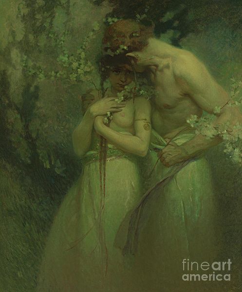 Curator: Pierre-Auguste Cot created this oil painting titled "Springtime" in 1873, exemplifying the Academic style of the time. What strikes you first about this piece? Editor: It’s an image of pure, unadulterated romance! The way the figures are entwined, almost weightless on that swing, evokes a carefree sensuality. The light seems to bathe them in an idyllic glow. Curator: Cot's painting became a popular symbol of youthful love, finding wide distribution through prints, tapping into the social appetite for romantic imagery in the late 19th century. What symbolic readings can you derive from this image of innocence and love? Editor: The swing itself represents a moment of joyful suspension, youth in bloom and promise of love, but also precarity of time. She, with her pallid dress, feels like a vision, barely tethered to the ground, to reality. They appear, with a bird observing them from above, to be at one with nature. It's a modern Venus and Adonis if you ask me. Curator: Cot expertly uses classicising forms – idealized figures, harmonious composition – but situates it within a genre scene of courtship. That blending of high art and relatable narrative contributed to its widespread appeal with the middle classes. Editor: Note also the absence of wedding bands or religious elements. Cot shows the pre-marital bliss, focusing on desire, an image celebrated as innocent even if undeniably charged. The garland on his body points at the beauty, the freshness of their union. It is very sensual. Curator: This approach aligns with the late 19th century art market which often prioritized accessible beauty and sentiment over more challenging artistic statements. Museums catered to that preference. Editor: Yes, "accessible beauty" is key, but also a romantic escapism. In times of fast growing cities and heavy industry, works like this transported viewers to simpler, perhaps imagined realities. The iconography points to nature's permanence and innocence of this romantic affection. Curator: "Springtime", in essence, tells a story about the desires and aspirations projected onto it, shaping our understanding of beauty, love, and the art world of its time. Thank you for adding such insightful symbolic readings. Editor: An absolute pleasure. The enduring fascination with works like "Springtime" demonstrates our constant quest for the idealized, the romantic, in art and life.