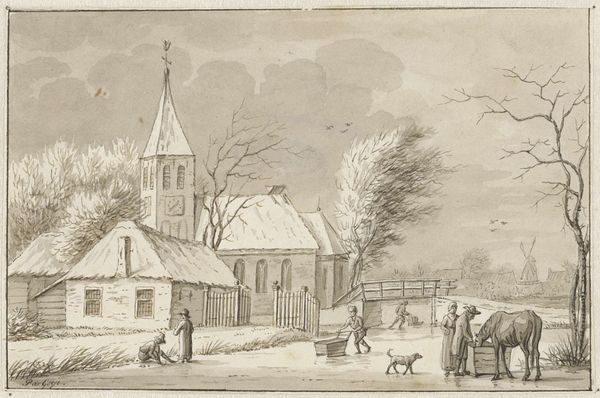 Curator: Ah, this understated beauty is "Grote Kerk te Vreeland," or Great Church at Vreeland, etched by Elias Stark in 1887. It’s currently held in the Rijksmuseum collection. Editor: It’s got a lovely stillness to it, doesn't it? The texture created by the etching feels almost like a whisper. Curator: Stark’s work here is really interesting when you consider the wider context of printmaking in the late 19th century. Etching had become quite democratized, allowing more artists access. How do you read its construction? Editor: The composition is carefully arranged; the church is the obvious focal point, but it’s balanced by the dark mass of the trees to the right and the adjacent building. The line work emphasizes the forms while capturing the light falling on the building. The technique employed using the etching allows a fineness of detail that contributes to its delicate and understated beauty. Curator: I see it reflecting the shift in artistic production towards making art accessible, cheaper. It’s reproducible and relatively fast to produce which opened art making to middle class citizens. But what does the Great Church itself tell us? Editor: True, but in considering its symbolism, the Great Church, represented through formal choices, suggests an interest in structure and how it defines spaces where people can be accommodated as its dominant presence evokes timelessness. I see both Baroque and realist stylistic cues; perhaps this speaks to Stark attempting to connect with an audience seeking stability as well as something familiar. Curator: Exactly. Stark, making a cityscape scene easily accessible to those at Vreeland, creates an intersection of both the grand themes with recognizable daily life. It speaks volumes about labor of artistic production that enabled accessibility and reproducibility to grow within the late nineteenth century. Editor: So, in essence, the formal qualities contribute not just to the artwork’s mood and tone, but also underscore its deeper thematic significance, highlighting human endeavor against grand history. Curator: Precisely, this quiet town square is brought to many far beyond its actual borders! Editor: What a perfect marriage of form, theme, and historical context. Thank you.