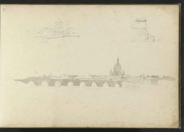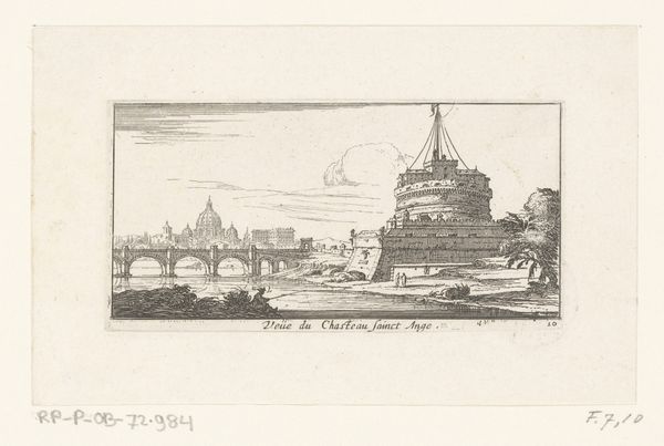 Vilhelm Kyhn created this small etching titled "Parti ved Engelsborg og Peterskirken," whose date is unknown. Look closely at the arrangement; the composition is structured around the contrasts between the solid forms of the Castel Sant’Angelo and St. Peter's Basilica, balanced by the flowing water. Kyhn uses line and texture to define the architectural and natural elements. The etching technique allows for fine, detailed lines that capture the textures of the stone and water, creating a rich visual experience despite the limited color palette. Note the light and shadow, achieved through cross-hatching. Consider the semiotic structure: the castle, a symbol of secular power, stands in contrast to the basilica, representing religious authority. The bridge acts as a connector, both physically and symbolically, linking these two spheres. This invites reflection on how power and faith intersect in the urban landscape. The simplicity and directness of the lines encourage us to consider the relationships between these powerful symbols.