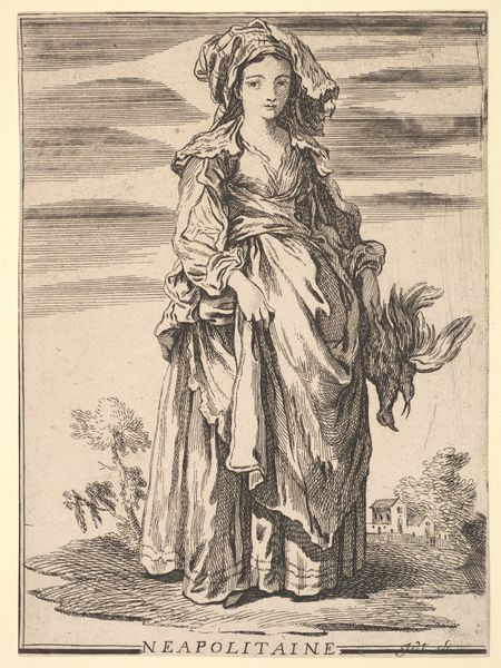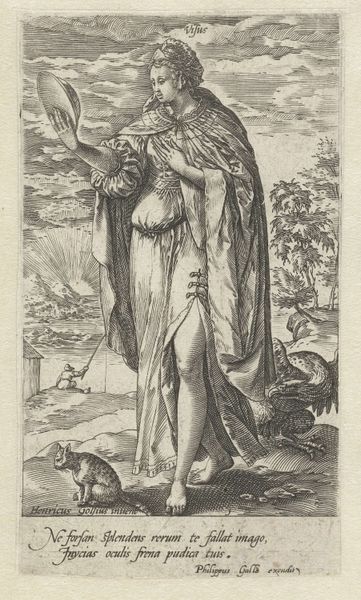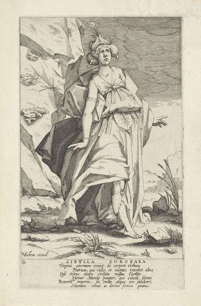 Curator: Well hello there. Isn't she striking? This engraving, “Perzische Sibille” – or Persian Sibyl – was made before 1608 by Christoffel van Sichem I and now hangs in the Rijksmuseum. Editor: It's incredibly detailed. And the Sibyl looks so… thoughtful. There's almost a sense of melancholy, a pensiveness. How do you read this print? Curator: Melancholy, yes, that’s one way to see it! For me, her posture, and especially that vacant look – coupled with the horn and regal headpiece – whispers of the burden of prophecy, the weight of seeing what others cannot, the burden of being special. But tell me, do you think van Sichem captures an authentic representation or are they playing into an established set of symbols? Editor: I’m inclined to say that the symbolic is primary here. All these carefully included details that convey what’s important for a person of authority. The horn looks less functional than ceremonial to me. It’s intriguing. Curator: Exactly! And in that “ceremonial” nature we find a mirror reflecting societal expectations. Van Sichem may have wanted to depict the cultural meaning of prophecy at this moment, instead of capturing her inner life. Editor: So interesting how this piece sparks conversation around these questions! Curator: Right! These works encourage us to actively look and wonder and bring our own questions into play. Always enriching the exchange with what we bring to the viewing experience.