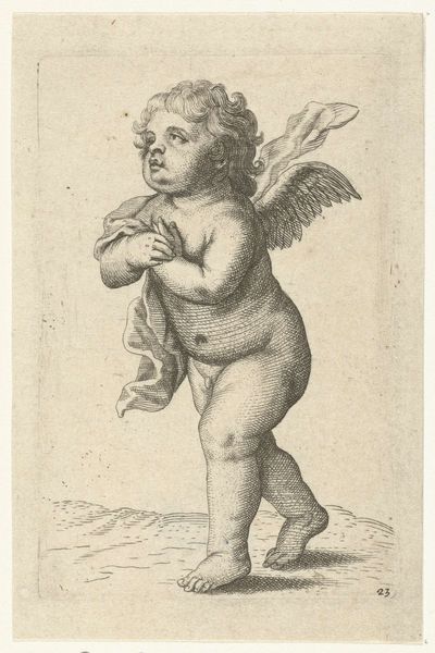 Curator: Well, isn't this little tyke something? Immediately puts me in mind of my own childhood--mud pies and mayhem, I suppose! Editor: We are currently observing “Half-Naked Child with a Bowl”, an engraving created sometime between 1630 and 1652 by Pieter van Avont. This piece, housed here at the Rijksmuseum, captures a distinct baroque style through its figuration of a child in a genre painting. Curator: Genre painting, eh? Baroque formality aside, there's such a casual quality here, don't you think? He's reaching for something, with such curious determination etched onto his little face. Makes you wonder what's caught his eye--or his appetite! Editor: Indeed. Note the precision of line and form van Avont employs. The diagonal posture of the child, for example, directs the viewer's eye toward his outstretched hand. The empty bowl at his feet adds to the compositional dynamic, acting as a visual anchor which serves to juxtapose aspiration with emptiness. The stark lighting further sculpts the figure, emphasizing his rounded contours in that distinctly baroque manner. Curator: You are quite right! Still, there's also this wonderfully mundane thing, isn't there? Here’s a kid, captured between crawls with the same hopeful grab for *something* any of us might exhibit. Makes this old engraving startlingly… well, contemporary. And makes me feel sentimental towards art that's not usually sentimental at all, so kudos! Editor: A perceptive interpretation, certainly. It is in this interplay between the structural precision of its rendering and the accessible emotion it depicts that we encounter van Avont’s genius. Curator: That's true. The details give the everyday such dignity. Van Avont is more than the Baroque rigidity--it's the unexpected kindness peering through. Editor: I agree wholeheartedly. The careful design elevates an unremarkable subject and turns the normal to profound through form.