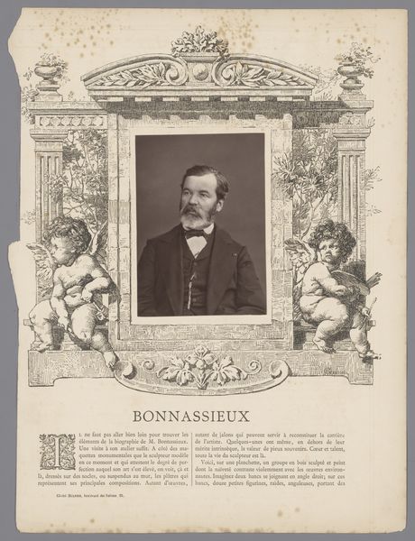 Editor: So, this is a portrait of Aurélien Scholl by Etienne Carjat, likely before 1879, made using the gelatin silver print process. It has such a theatrical flair with that ornate frame, doesn't it? What catches your eye about it? Curator: The means of production here is key. Think about the materiality of the gelatin silver print. It democratized image-making. But look at the larger context. Here, it's re-packaged within this elaborate theatrical advertising. There's an interesting tension there: photography, a relatively accessible medium, used to promote something potentially exclusive like Parisian theater. What does that tension tell us about the relationship between art, commerce, and access? Editor: That’s fascinating. It makes you wonder about who the target audience was. I suppose they’re trying to bridge the gap between popular culture and high art. Curator: Exactly. It is fascinating to analyze this particular mode of photographic printing and its entanglement with class and the economics of art consumption at that time. Editor: I hadn't considered the connection to advertising and its role in disseminating and framing portraiture in that era. Thank you. Curator: And I found it helpful to be reminded of the practical, material nature of artmaking and how it affects our perceptions of value.