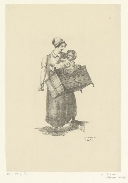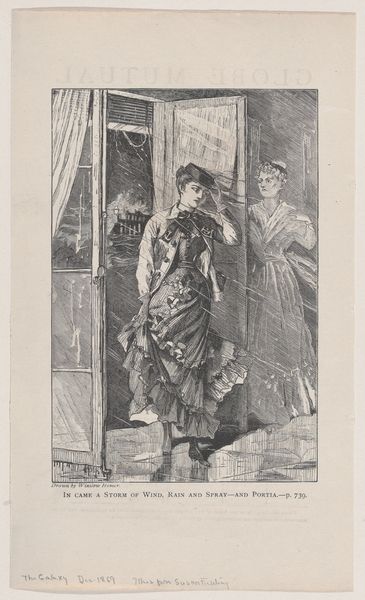 Curator: This etching by Henrik Arnold Hamilkar Sørensen, created between 1884 and 1897, is actually a proof print intended as an illustration for P.M. Møller's "En dansk students eventyr." What are your initial thoughts? Editor: The overwhelming feeling is one of cautious movement. There's a sense of someone testing the waters, both literally and figuratively, presented through the detailed, yet almost unsettling lines of the landscape. Curator: Unsettling is interesting. Let’s explore that. Consider the density of lines in the foliage versus the relatively smoother tones defining the figure's dress. Notice also the contrast between the precise hatching describing the muddy path and the blurred background that gives a sense of distance. Does that shift your reading of the mood? Editor: It heightens it, actually. The attention to detail lavished on the path she treads makes me think about the constraints placed upon women in that era. Even a simple walk becomes fraught with the potential for missteps and the ever-present scrutiny of society. Curator: Ah, now that’s a lens that opens up so many possibilities. Looking just at composition though, the subject dominates, off-center but anchoring the visual weight, leading our eyes deeper into the rural scene and focusing attention onto the structural dynamic between foreground, middle ground, and background. What significance might you give this in relation to her social situation? Editor: To me it signals how individual stories always play out against the broader backdrop of social norms and expectations, her potential narratives both intimate and determined by a shared cultural story of possibilities, constraints and available opportunity. I wonder if her gesture also points beyond a purely practical step, perhaps looking toward what lays outside of reach for someone from her station in life? Curator: So the image becomes a tension between individual agency and societal constraint, presented through visual and thematic composition. Editor: Exactly. Thank you; it makes me wonder how many readings one etching can bear, shaped both by what Sørensen gives us, and what each viewer brings. Curator: And on that very insightful note, it looks like we must conclude our observations.