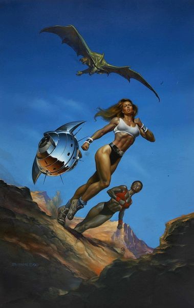 Editor: Here we have Boris Vallejo’s 1991 oil painting, “Gryphon Mythology.” What strikes me immediately is the improbable partnership – the nude figure seeming to command this powerful, mythical beast. What's your take on the relationship between the human and animal forms in this artwork? Curator: Ah, yes, "Gryphon Mythology." It's that tantalizing dance between vulnerability and strength, isn’t it? I see this not as command, but as a profound symbiosis, almost a shared soul. Notice the shared gaze toward some unknown horizon? Vallejo understood that mythology lives within us, a primal urge to connect with forces larger than ourselves. The human is stripped bare, returning to nature, finding kinship in this fantastical creature. Editor: That’s an interesting point about symbiosis! I was thinking more in terms of classic hero-and-steed imagery. But what does it *mean*? Curator: Meaning is a slippery fish, darling! But for me, it whispers of humanity's longing to transcend earthly limitations, to take flight on the wings of imagination. Do you feel that yearning in yourself? Perhaps we aren’t meant to understand, only to feel the wind beneath those shared wings. Editor: I guess I can see that. It makes the painting feel…bigger somehow. Curator: Exactly! Art doesn’t need to be solved like a riddle. Sometimes, it’s just a hand reaching out, asking you to join the flight. Editor: I appreciate you pointing that out - thank you! Curator: Anytime, my dear. Always a pleasure to ponder the fantastical.