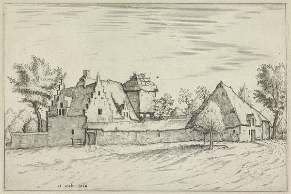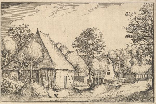 Curator: Here we have "Farms in a Village, from "Regiunculae et Villae Aliquot Ducatus Brabantiae"", an etching made sometime between 1605 and 1615 by Claes Jansz. Visscher. It's part of the Dutch Golden Age collection. Editor: It’s incredibly detailed! And yet, there's a quiet stillness. Those thatched roofs seem to bear the weight of years, a history etched into the very landscape. Curator: Indeed. Visscher was very much invested in showing the common world as shaped by the growing dominance of the Dutch mercantile class. Look at the specific placement of the farms, the organization of space and fields: you have in miniature a visual program for control. Editor: I'm struck by the choice of etching for something like this. The linear quality of the etching certainly complements the scene's precision but also adds an aura of fragility. What symbols are revealed with closer study? Is there some common image associated with farmsteads of the time? Curator: That's an astute observation! It goes to a wider phenomenon in 17th century Netherlands. Artists sought to demonstrate the unique character of the Dutch region: farms and other features that made their towns different. Editor: There's a kind of universal archetype present here, even for those of us separated by centuries. Curator: Certainly, images of Dutch industry gained even greater value as ways to demonstrate social mobility within a nascent republic, in sharp distinction to earlier dynastic visual traditions. The presence of a dog is no accident. Editor: Interesting! It makes sense, a culture defining itself by its practical labor, depicting its homeland with an unembellished accuracy and everyday purpose. What does it tell us when an ordinary working dog is a focus of artistic output? Curator: And how art itself serves as both a reflection of this culture, and also as a means to propel these ideas further through the cultural consciousness of Europe! Editor: I think the dialogue between everyday realism and broader, symbolic ideas about work and place helps us understand the era more completely. It's very powerful.
