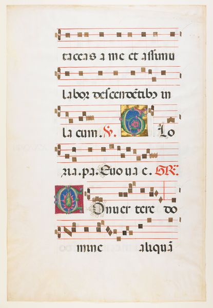 Curator: Here we have a page from a Benedictine Antiphonary, created sometime between 1467 and 1470 by Belbello da Pavia. It’s currently held at the Metropolitan Museum of Art. Editor: Immediately striking are the colours – that vibrant illumination against the aged parchment, the red staves holding those precise, dark notes. There's a lovely visual rhythm to the page. Curator: Yes, the interplay of colour and form is paramount here. Notice how the illuminated letters—particularly the S and the E—are not mere decoration but integral compositional elements, leading the eye through the text and music. Editor: Absolutely. But consider the historical context too. This wasn't simply about aesthetics; it was about power and authority. The Benedictine order was a significant landholder, and these antiphonaries, displayed in monastic settings, reinforced their cultural status through opulent craftsmanship. The intricacy must have also reflected the immense dedication involved. Curator: The lettering itself is a fascinating study in line and shape, wouldn't you agree? The blackletter script provides a beautiful contrast to the more organic forms within the illuminated initials. I am curious as to your interpretation of the text? It is likely from The Book of Psalms. Editor: I understand it’s music and text meant for monastic choral singing, possibly sung for hours daily. The daily rhythm, perhaps, could inspire or constrain artistic expression. Also, think about who commissioned the work, what resources they brought to bear. Did they expect others to find beauty or value in these works, or to be cowed? Curator: Precisely! Each design element is precisely balanced with one another in ways both harmonious and structurally sound, ensuring balance. This harmony ensures a visually complete composition on a plane of its own, something truly breathtaking when compared with lesser works. Editor: I agree that a work of art in its time speaks to the concerns of power structures, but also serves to display a collective desire for transcendence through the divine word made flesh in beautiful form.