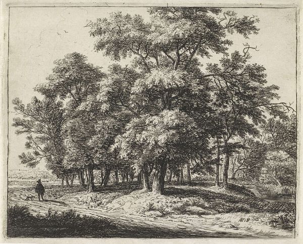 Franciscus Andreas Milatz created this landscape with a farmer and his cattle using etching techniques, likely in the late 18th or early 19th century. What might seem like a simple pastoral scene actually reflects profound social and economic shifts in the Netherlands during this period. The etching presents an idealized view of rural life, one that emphasizes harmony and traditional labor. But this imagery obscures the economic realities of the time. The rise of capitalism and urban centers was placing immense pressure on rural communities, altering agricultural practices and displacing many farmers. Such landscape prints played a role in constructing a nostalgic vision of the countryside. The viewer should consider how these images may have functioned within the art market, shaping perceptions and perhaps even masking the complexities of a changing society. To understand this work more fully, you might look into the printmaking industry of the Netherlands and the economic conditions that shaped the lives of farmers like the one depicted here.