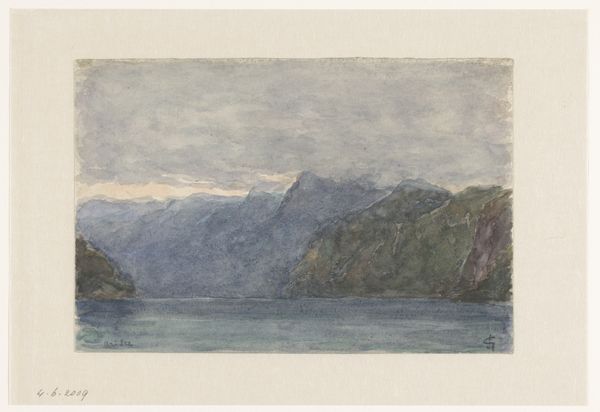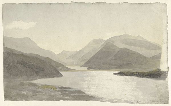 Editor: This is Francis Towne's watercolor, Bisone, at the Tate. There's a stillness to this scene, and the mountains feel almost like guardians. What symbols or underlying meanings do you see in this work? Curator: The mountains here resonate with a primal sense of protection and permanence, reflecting our enduring human fascination with nature's power. The clouds, often symbols of transformation, juxtapose this sense of solidity. What feelings do those competing ideas evoke for you? Editor: That makes me think about the fleeting nature of life against the backdrop of something timeless. I hadn’t considered the clouds that way. Curator: Precisely. Towne captures that dialogue, that inherent tension between the ephemeral and the eternal, a visual conversation that echoes through time. A landscape imbued with symbolic weight. Editor: It’s incredible how a simple scene can hold so much. Thanks for pointing that out. Curator: My pleasure. Always look for the stories within the images.