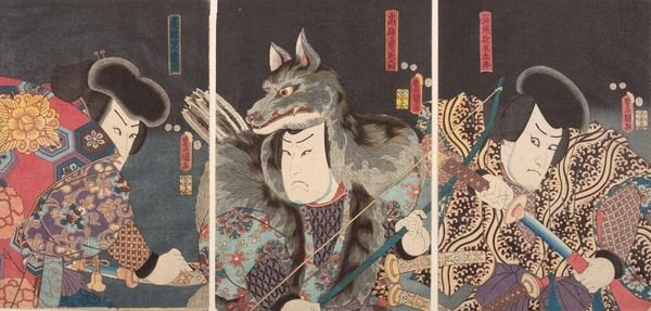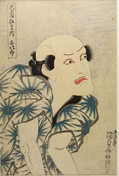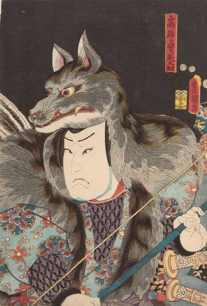 Editor: This is Utagawa Kunisada’s woodblock print of “Actor Ichikawa Danjūrō 7th as Matsuomaru." I am struck by the intensity of the actor’s gaze. What's your interpretation of this dramatic portrait? Curator: He’s caught between duty and sorrow, wouldn't you say? The rigid lines of the costume contrast with the vulnerable expression, like a tightly leashed storm. It's the Kabuki theatre distilled into a single, heart-wrenching moment. Editor: I see that tension now; the bold dragons against that anguished face create such a powerful contrast. It really makes you wonder about the story behind the performance. Curator: Exactly! Art isn’t just about what you see, it’s about feeling the story ripple beneath the surface.