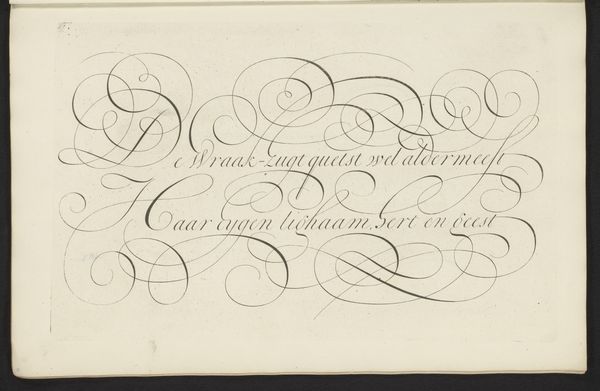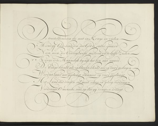 Curator: Looking at this work titled "Schrijfvoorbeeld: Wie kruypt nog met syn Zinnen (...)" by Bastiaan Boers, dating from 1660 to 1751, it strikes me as a fascinating exploration of the relationship between language, craft, and artistic expression within the context of Baroque aesthetics. Editor: Whoa, talk about swirls! It feels like I'm looking into the eye of a gentle, calligraphic hurricane. Does anyone else get a feeling like words are trying to dance their way off the page? Curator: Exactly! Boers utilizes ink on paper not merely as a vehicle for text, but elevates the very act of writing to an art form. Think about the social function too. Calligraphy was tied into systems of knowledge, record keeping, but here it borders pure artistry. The work itself tests those neat distinctions. Editor: I dig that. It reminds me a little of those illuminated manuscripts, but without the pressure of feeling overtly religious or serious. I'm almost getting the vibe that Boers was scribbling for pure joy of it all! Did you happen to notice the lines between letters? They create the feeling of one giant chain. Curator: A playful mood definitely comes across. The materials speak volumes about the possibilities present even with constrained means. Here the relationship between maker, the readily available materials, and the function all fuse. It isn't fine art meant to be hung high, but it is valued labor. Editor: It’s true, isn’t it? Each swoosh, each delicate curve, is a tiny testament to his patience and precision. When you step back and think about all that focused intention, it adds a whole other layer of... reverence, I suppose? Like, look how lovingly the creator has formed each stroke. Curator: Precisely! And beyond the aesthetics, this showcases the broader understanding of 'art' at the time and its interaction with material culture and pedagogical techniques that circulated around that area of Europe at that moment. I wonder who handled this next and in what condition? Editor: It's pieces like this that makes me think of history less as a timeline and more as an ecosystem. Curator: I agree wholeheartedly. Viewing it through the lens of labor, the relationship to commodity, this offers fresh perspective. Editor: Alright, I think my heart has fully merged with the page now. Thanks! Curator: Likewise, a fascinating exploration through focused looking.