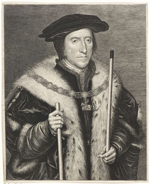 Editor: Here we have what is believed to be Peter Paul Rubens' "Portrait of Sir Thomas More," rendered in oil paint. It strikes me as quite somber, with the subject looking off in quiet contemplation. What do you see in this piece? Curator: I see a careful construction of identity and an evocation of a complex legacy. Notice the fur-lined cloak, the Tudor bonnet; these are symbols of status and intellect. More's gaze, averted yet piercing, suggests a man wrestling with difficult choices, choices laden with personal and political consequence. Editor: So the clothing isn't just about representing his wealth, but it's symbolic? Curator: Precisely. Clothing, in portraiture of this era, acts as a carefully constructed language, signaling social standing, piety, and even allegiance. More holds a small, rectangular object. It might be a book, a letter, or perhaps even a badge of office. Each of these details carries significant weight. Editor: That’s fascinating. It almost feels like Rubens is deliberately layering meaning into every aspect of the composition. Curator: Indeed. Even the muted palette contributes to the overall feeling of gravitas. Consider also how this image might function within the broader context of More’s life, particularly his eventual execution. The portrait takes on added emotional power. Editor: Thinking about his execution really shifts how I perceive the painting. Knowing his fate adds a layer of tragic irony to the depiction of a man of power. Curator: Exactly! The image is a potent reminder that outward symbols of status and accomplishment can often belie inner turmoil and impending doom. The portrait immortalizes not just the man, but the complexities inherent in his position, faith, and ultimate sacrifice. Editor: It's incredible how much symbolism is packed into a single image. Thanks for illuminating that for me! Curator: My pleasure. Remember, looking at art isn't just about seeing what's there; it's about understanding what it signifies, and the emotions it stirs within us.