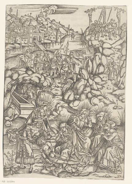 Editor: This is "Ecce Homo" by Hans Lützelburger, created sometime between 1502 and 1510. It's an engraving, so the detail is astonishing. It strikes me as a chaotic yet incredibly precise depiction of a biblical scene, what do you make of its composition? Curator: Observe how Lützelburger orchestrates space through stark lines, dividing the pictorial plane into a series of distinct yet interwoven zones. The figures are positioned along diagonals, which pull our eye in different directions simultaneously. Do you perceive the effect of this deliberate fragmentation? Editor: I do. It makes the scene feel active, even turbulent. The architecture seems to both contain and amplify the tension, especially with those repetitive geometric motifs. Is there any significance in the patterning itself? Curator: The patterned elements are vital to appreciating the artist's meticulous technique. Semiotically, we might consider these motifs as visual signifiers, directing our eye and adding to the dynamicism inherent in this complex configuration. Note also the intricate line work, it creates contrasts of light and shadow adding to the mood of solemnity. Editor: So the engraving’s power lies not only in the narrative, but also in the calculated deployment of form and technique. It's not just what is depicted, but how it's depicted. Curator: Precisely. Lützelburger transforms a traditional subject into a masterful exercise in structure and form. Editor: It’s fascinating to consider it this way. Thank you! I will consider that art can create complex structures that play out visually.