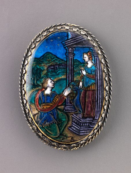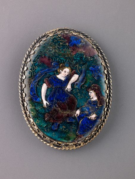 Curator: Allow me to introduce a piece titled "Watch," crafted between 1615 and 1630, and attributed to the skilled hand of David Ramsay. It’s currently held in the Metropolitan Museum of Art's collection. Editor: Well, my first impression is how strikingly the artist employed color within the oval frame. There’s something incredibly evocative in that juxtaposition of cool blues and greens with the figures' ruddy complexions. Curator: Indeed. Considering its history, this ornamental watch reflects both technological advancement and aristocratic tastes of the Jacobean era in England. Watches were transitioning from novelties to status symbols. Editor: I see Mannerism reflected here, definitely. Observe the elongated figures, and the self-conscious display of skill. It’s not just about portraying a scene, but flaunting artistic ingenuity. It's decorative art aiming higher. Curator: Precisely. Ramsay, as a watchmaker to the King, would've been catering to a clientele interested in pieces showcasing both artistry and craftsmanship. Its function as timekeeping is almost secondary to its symbolic value as a display of wealth and education. Editor: Let’s talk about that scene—is it a known mythological tale? The hunter aiming, the figure reclining, potentially wounded? What statement is being made? It's an allegory, certainly, or perhaps a moment lifted from some romantic history. Curator: The narrative could represent several classical sources involving a hunt, possibly alluding to themes of mortality, destiny, and the hunt as a metaphor for life’s pursuits and challenges. Editor: The medium contributes to its impact, too. Enamel work offers a jewel-like quality, intensifying the colors and providing incredible detail in miniature. One must consider how that reflects broader society; it speaks to value placed on objects as both functional and refined things. Curator: Viewing art, it's too easy to get caught up in our present-day biases. Considering “Watch” within its time invites reflection upon time itself, a common theme during the 17th century. Editor: Agreed, by investigating formal construction, medium and historical roots we can move beyond mere aesthetic evaluation. It's an elegant lesson in intertwining art, utility, and power.