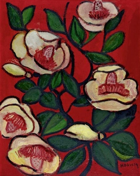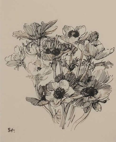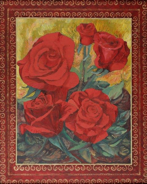 Editor: This is "Kamelien" or "Camellias" by Helen Dahm, made in 1955. It's a pastel painting, and there's something so intimate about the scale and the swirling colours; it feels like you're peering into a secret garden. What captures your attention most when you look at this? Curator: Oh, the immediacy of it! It's like a memory of a garden, rather than a portrait. The deep pink almost vibrates, and those camellias seem to hover, don't they? They’re rendered in such a tactile way, you almost feel like you could brush your hand against the velvety petals. Dahm’s work often explored her inner world, almost like visual poems. Does it evoke anything particular for you? Editor: It does have a dreamy quality! And the contrast between the dark leaves and pale blossoms is striking. I’m wondering, do you think this captures a specific moment, or is it more about capturing the essence of the camellia? Curator: I lean towards essence. Think of Georgia O’Keeffe, but with a bit more wildness and looseness! It’s about feeling the flower, internalising its beauty, and letting it spill out onto the page. Look how the pastel strokes dance around the forms. What do you think Dahm wants to convey with this frenetic movement? Editor: I think it's freedom. The way she hasn’t constrained herself by precise realism mirrors the uncontained growth of nature itself. Curator: Exactly! It reminds us to trust our intuition and not get bogged down in the details. Art should be lived and felt, much like nature itself! I came into this thinking of composition and negative space but will leave seeing so much joy.