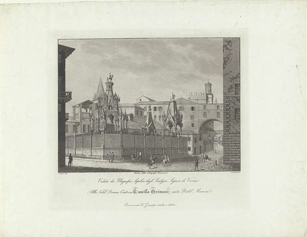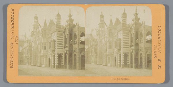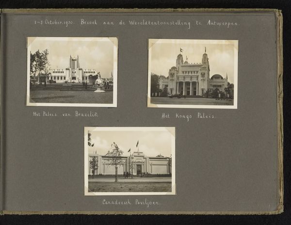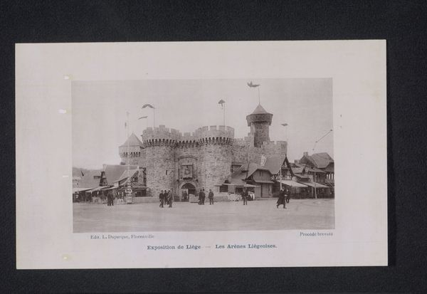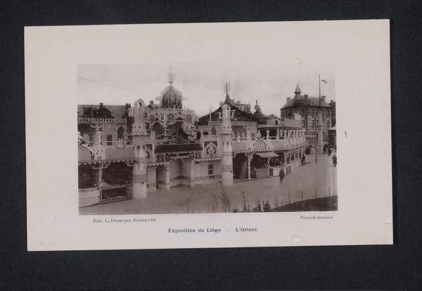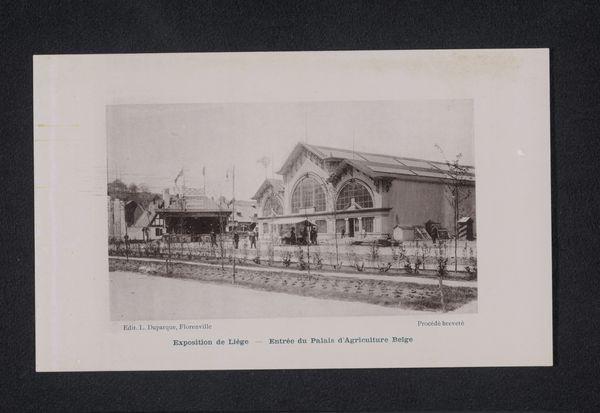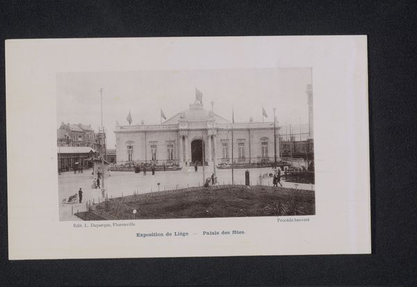 Curator: This gelatin-silver print captures "Gezicht op de Wereldtentoonstelling van 1905 in Luik," or "View of the World Exhibition of 1905 in Liège." It’s a remarkably crisp photographic document from that era. Editor: It certainly has a strong central composition, directing the gaze inwards along those curving tracks. There’s a wonderful play of light and shadow giving it a solemn yet optimistic tone. Curator: Observe how the photographer utilizes the linear perspective to create a sense of depth. The repetitive verticality of the flagpoles adds to the image's architectural rhythm and formal structure. Editor: Beyond that architecture, the image reads to me as a temple of industry and progress. Note how the dark flags atop the dome create a stark contrast with the elaborate façade of the central hall, signifying power and ambition. Curator: Precisely. And the cityscape itself becomes a subject. Here the artist depicts urban development with a rigorous adherence to realism, showing both grand structures and human scale in relation. Editor: The inclusion of the classical statue also provides a dialogue between past ideals and the aspirations of the industrial age. The overall symbolic weight makes me think about Belgium’s complex role in colonialism and trade at this moment. Curator: Interesting. Structurally, the light coming through the openings really emphasize an attention to interior space. The organization of elements creates not just a document but an aestheticized perspective. Editor: I see it as more than just aesthetic. These world fairs, now documented in silver halide, represented dreams of global interconnectedness but also the undercurrents of geopolitical tensions in early 20th century Europe. Curator: Thinking of the building materials, photography itself was undergoing radical technical advancement at this time. This picture manifests the possibilities of modernity at both representational and material levels. Editor: Ultimately, this piece becomes a poignant reminder of past futures. An intriguing photographic imprint of a specific time, freighted with symbolic potential, realized through precise formal organization.