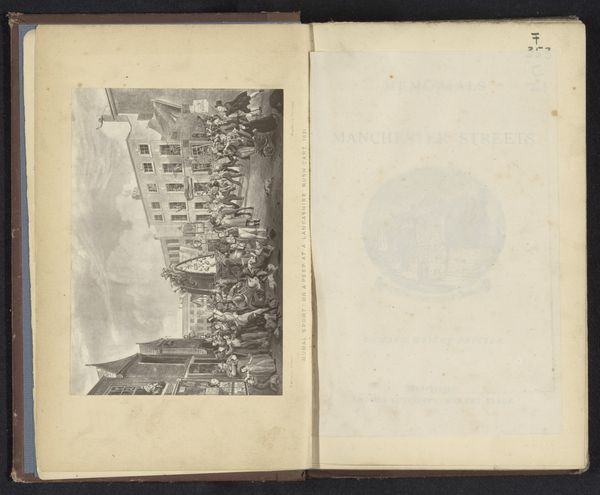 This photograph titled 'Begrafenisstoet van Henri d'Artois'—or Funeral Procession of Henri d'Artois—is by A. Vallois. It features an albumen silver print adhered to a page. The high-angle shot dominates the composition, presenting a procession moving away from us through a narrow street. The buildings on either side, marked with repetitive windows and subtle architectural details, create strong vertical lines that converge toward the horizon, intensifying the sense of depth and receding perspective. The monochromatic tones emphasize the play of light and shadow, casting the figures into indistinct shapes, which adds to the solemn atmosphere. The visual structure of the image, with its calculated use of perspective and light, suggests a careful construction aimed at capturing not just an event, but the somber mood and historical weight of the occasion. Vallois uses the formal qualities of photography to create a symbolic representation of mourning, where the structure of the image mirrors the order and gravity of the event itself.