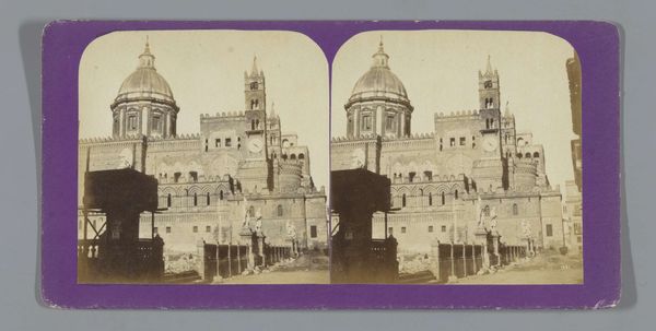 Jean Andrieu created this stereoscopic photograph of the Porte Cailhau in Bordeaux sometime in the mid-19th century. Two nearly identical images sit side by side, framed within a purple border, inviting the viewer to experience a three-dimensional depth when viewed through a stereoscope. The photograph's composition is dominated by the architectural forms of the gate and the surrounding buildings. Andrieu’s photograph offers a study in contrasts between the solidity of the stone structures and the ephemerality of light and atmosphere. Note how the texture of the stone is rendered through subtle gradations of light, creating a palpable sense of depth and volume. The stereoscopic format itself underscores a central theme of duality and perception, offering a unique way of seeing and understanding our surroundings. In its time, this photograph offered not only a view of a distant place, but also a new way of experiencing space and representation.