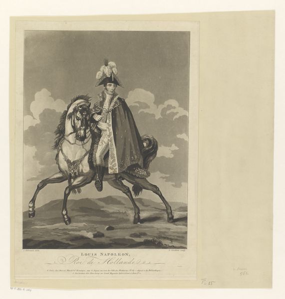 This is Abraham Vinkeles's portrait of Willem II, King of the Netherlands, made using an unspecified medium. The portrait is strikingly linear; notice the sharp delineation of form, which lends the composition a precise, almost diagrammatic quality. Vinkeles constructs a portrait where the figure and the horse, though rendered in soft watercolour, possess a distinct, graphic presence against the understated landscape. Consider how Vinkeles uses scale to convey the figure's authority, subtly exaggerating his height relative to the horse. The composition employs a flattened perspective, minimizing depth and focusing instead on the surface arrangement of forms. This flatness serves to highlight the symbolic rather than the representational aspects of the image. The portrait operates within a system of signs, where clothing and posture are not merely descriptive but encoded with social and political meaning. Ultimately, the work prompts reflection on the interplay between representation, power, and the construction of identity within the visual landscape of early 19th-century portraiture.