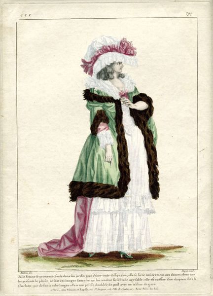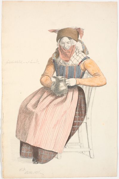 Curator: Jane Iverson’s watercolor, "Doll," created around 1936, offers a fascinating glimpse into a specific type of genre-painting. Editor: My immediate impression is one of warmth, yet also of hardship. The figure’s burden is clearly visible; she carries so much, literally and perhaps metaphorically. Curator: Indeed. Genre paintings often capture everyday life, reflecting social realities. Iverson, though, as a white artist portraying a Black woman during the Depression era, enters complicated terrain. What societal role did art have during such periods? Editor: Absolutely, the symbolism is potent. Consider the large basket atop her head, possibly full of goods or laundry; she embodies labor and resilience. Also the doll that she is holding could have symbolic implications too. Notice how both the adult and the doll carry something – could Iverson be implying a legacy of labor and care passed down? Curator: That interpretation brings an added layer of meaning, especially considering how Black women have historically been portrayed within and outside art. The context of its time dictates that it exists within an arena of race and class dynamics. But is this observation of labor necessarily empathetic or potentially exploitative in its gaze? Editor: It's a difficult question, right? What did the "Doll" image signify during the Great Depression? Was this a visual commentary on survival, or did it merely propagate a societal gaze? Curator: Those very questions I think give Iverson's artwork such value today. It enables contemporary scholars, critics, and viewers to reassess that very social landscape. Editor: Yes, viewing this, I reflect on visual symbols from the past, understanding their psychological and cultural impressions which continue even now. It is more than just pretty watercolour.