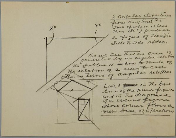 Editor: This is "Art Theory Text with Color Diagram" by Stuart Davis. It's hard to pin down a date, but it feels like a glimpse into the artist's mind. I’m struck by the use of color blocks and cryptic handwriting. How do you interpret this work? Curator: For me, it's like peeking over Davis's shoulder as he's building his visual language. His notations – "Emotional context," "Size, Direction, Color" – are breadcrumbs to his artistic process. It's almost as though he’s mapping out a city of color and form. What do you make of the handwritten text? Editor: It's dense! But I see him wrestling with the relationship between the object and illusion. Curator: Exactly! It's the beautiful mess of thinking – a reminder that art is as much about the questions as the answers.