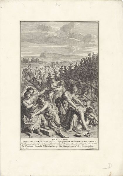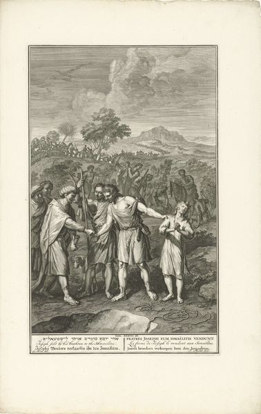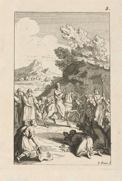 Curator: Pieter Sluyter is believed to have created this engraving, titled "Baäls altaar door Gideon vernield", sometime between 1705 and 1728. It's currently held at the Rijksmuseum. Editor: My eye is drawn immediately to the destruction depicted – the fiery altar contrasted against the solemn faces in the foreground. It feels like a moment of both triumph and profound reckoning. Curator: Indeed. Sluyter captures the narrative of Gideon destroying the altar of Baal, a significant event of iconoclasm in religious history. It reflects a time when the rejection of established deities was both a political and a spiritual act, resonating with themes of liberation and resistance against perceived idolatry. This piece asks us to consider what symbols we, too, allow to hold sway. Editor: And Sluyter's use of symbolism is quite potent. Notice the subtle inclusion of the dog, almost like a silent observer. Dogs often symbolize loyalty, vigilance, or even the more base instincts. It introduces an interesting layer of commentary about human motivations. Is the destruction borne out of righteousness, or something less pure? The image feels as much about internal struggles as external actions. Curator: That’s a brilliant observation. We see through the art also cultural anxieties around religious dominance of one faith over others. In early modern Europe, the questioning of religious orthodoxy was increasing, fueled by political and social changes, particularly after the Reformation. This print participates in discourses around faith and cultural identity and highlights a struggle against dominant power structures of the day. The central figures of this narrative embody a resistance movement against established powers. Editor: Right. And look how the composition divides the earthly figures from the imposing idol of Baal in the distance. It amplifies the scale and perceived threat of that prior belief system, and shows their struggle. The use of fire is key too, purifying yet devastating, indicating transformative—though also violently achieved—change. It is a warning. Curator: This engraving is much more than just a historical depiction; it encapsulates profound historical, emotional, and social conflicts. Editor: It definitely makes me ponder the lingering power of visual symbols and the weight they carry through history. It is thought-provoking.