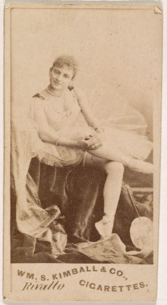 Curator: This is an albumen print dating back to 1889. It is part of the Actresses series by William S. Kimball & Company, titled "Nellie Beaumont." Editor: It strikes me as both intimate and oddly impersonal, almost like a posed snapshot attempting casual elegance. The muted sepia tones reinforce that distant feeling, somehow. Curator: Note how the composition places Nellie Beaumont in a contained space. Her seated pose, with arms crossed, mirrors a sense of self-containment that is at odds with the commercial nature of its production and placement on cigarette packages. Editor: Yes, she embodies an idealized image of women that was rigidly defined by gender expectations. The print's function, advertising cigarettes, situates Beaumont as an object of desire and commerce, flattening her individuality into a mere commodity. It certainly perpetuates troubling patriarchal ideas! Curator: Consider the tonal range here. The photographer utilized delicate gradations to capture light and shadow, highlighting textures in Beaumont's dress, headdress and the ornate chair on which she sits, effectively balancing attention between figure and setting. Editor: I do not want to neglect how an image like this reinforced social hierarchies by presenting idealized representations of femininity to reinforce certain notions of class, taste, and even acceptability to the primarily male smokers buying cigarettes. These promotional materials not only sold a product but also a lifestyle intertwined with dominant cultural values. Curator: Viewing Beaumont’s portrayal solely through this framework arguably limits a full understanding of the intended, multifaceted aesthetic design. We are meant to acknowledge that tension. Editor: Perhaps… Still, recognizing the powerful influence this has had through years of social conditioning feels fundamental to my reading. It encourages me to keep searching. Curator: Ultimately, through its skillful arrangement of tones, this simple advertisement functions as a window into the visual codes and sensibilities of the 19th century. Editor: Absolutely—a window through which we must critically examine the values it projects about the role of women within a rapidly industrializing society.