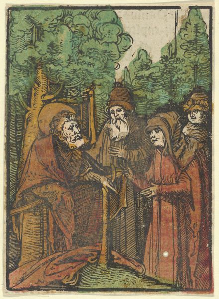 Hans Schäufelein’s “The Temptation of Christ,” a woodcut from Das Plenarium, presents a scene teeming with stark contrasts. The composition is split, with dense, dark greenery on the left balancing the lighter, open space on the right, creating a visual tension that mirrors the moral dilemma at hand. The figures, Christ and Satan, are rendered with a graphic simplicity typical of woodcuts, yet their interaction is charged with subtle cues. Note the color; the muted tones against the haloed figure of Christ work to amplify the visual and thematic dichotomy between good and evil. The use of line is especially striking. It defines form but also conveys texture, from the rough bark of the trees to the fabric of the figures’ robes. Schäufelein uses these formal elements to engage viewers with the narrative. This reflects broader artistic concerns of the period, where religious art served not just as a depiction but as a didactic tool, using composition and form to communicate complex theological ideas to a wide audience.