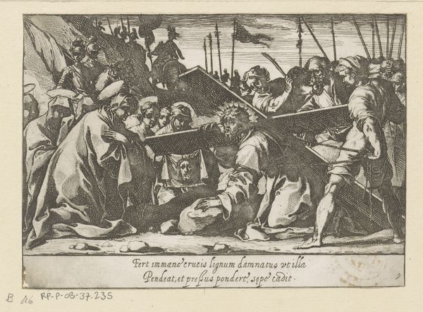 Editor: So, this woodcut is called "The Stragglers," made around 1520-1530 by Jan Wellens de Cock. It feels… chaotic, almost feverish, with all these figures crammed together in such intricate detail. What’s your take on it? What catches your eye? Curator: Oh, the feverish intensity is definitely there! For me, it’s all about that fascinating tension between the grand, historical narrative it hints at – perhaps a biblical flight, or some other exodus – and the sheer awkwardness of the figures. The lines feel so deliberately, almost playfully, ungainly at times, don’t they? It's as if de Cock is poking fun at the heroic ideal, finding humanity in the… well, the stragglers! I keep wondering, who are these people and where are they going? Are they being driven, or following willingly? Editor: That's interesting. It’s true, they don't look particularly heroic. There's a vulnerability, a weariness about them. And you’re right, the lack of refinement is sort of endearing, compared to the High Renaissance art of the time. Curator: Exactly! This is Northern Renaissance, a world away from Italian idealization. It’s earthy, a bit rough around the edges, obsessed with detail in a way that almost overwhelms. I wonder, do you see hints of other contemporary art in the approach of de Cock? Maybe even theater set design and the grotesque style trending? Editor: Hmm, that's a perspective I hadn't considered. I’m now thinking about that relationship, not just to grand historical painting, but the contemporary popular entertainment as well, makes it resonate more deeply with the average viewer! Curator: See? Now you're finding new levels! It is like walking along and realizing that it had depth. Now what would that suggest for current artists?