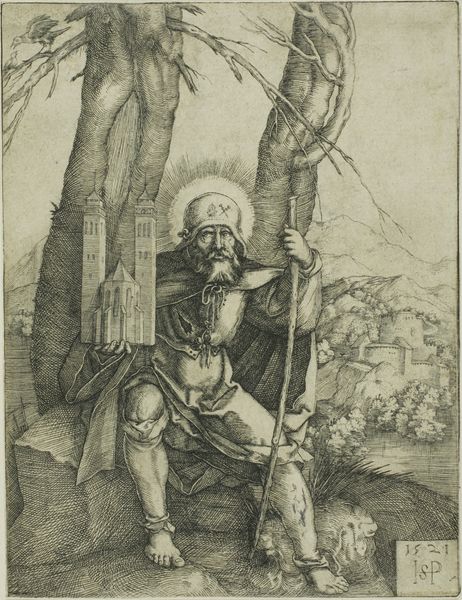 Curator: Sebald Beham's "Saint Sebaldus"—it feels almost like stumbling upon a secret world rendered in miniature. Editor: It's striking how such a small print, just about 12 by 10 centimeters, holds such weight. The saint's gaze is so direct, and he's holding this detailed model of a church, yet he stands barefoot in nature. Curator: The building is the Church of St. Sebald in Nuremberg. It’s an architectural symbol of the city’s religious heart, juxtaposed with Sebaldus's humble, pilgrim-like presence. It's all about contrasts. Editor: That contrast is key. Beham uses the symbol of the church to tell us not just about religious devotion, but about the relationship between the sacred and the worldly. He’s a barefoot Saint with a building, the earthly Church, in his hand. Curator: I find it curious that, despite the religious subject, there’s a raw, almost earthly quality to the Saint's depiction—that very humanity, made visible through Beham's sharp burin. Editor: In a way, the symbols invite us to ponder our own roles—architects, pilgrims, or somewhere in between—in constructing meaning around us.