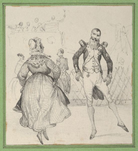 Curator: This is "Soldier with a woman on his arm in front of a wooden gate" by Victor Adam, made sometime between 1820 and 1866. It's a print. Editor: It has an interesting energy—almost satirical. The figures seem disproportionate, especially the woman’s elaborate hat. There's something off-kilter in the composition; not sure I'd hang it above my couch. Curator: Right. Adam was known for caricatures. You're seeing how fashion and military bearing are heightened to create social commentary, a poke at bourgeois society during the July Monarchy and Second Empire in France. Editor: The artist’s choice to emphasize the textural contrast is striking—the woman’s frilly clothing and that stiff uniform against the roughly sketched backdrop creates an awkward feeling of visual harmony, with tension, if that makes sense. Curator: That backdrop— the wooden gate with lettering suggesting "A la belle...", perhaps a shop or entertainment venue – is indicative of the burgeoning urban culture of the period. Places where soldiers and civilians mingled, blurring social boundaries. The print medium allowed these images to circulate widely, influencing public opinion and reflecting evolving social mores. Editor: And there's that slight upward angle we see, like looking up at the pair, subtly emphasizing their importance and simultaneously diminishing them in a visual sense, like they’re figures on a stage viewed from the cheap seats. That sketch-like technique really underscores that immediate, fleeting, impression. Curator: The "belle" would typically refer to a well-dressed and refined woman. Putting that ideal on display with the soldier tells us something about public perception towards class, social aspirations, the relationship between military might and idealized femininity, and changing cultural ideas in French society. Editor: So, it's less about romantic representation and more a commentary of… what was publicly displayed? Curator: Exactly. It gives a great look into how social roles were evolving, and more particularly, perceived. Editor: A small print that speaks volumes then. I definitely see more than just some charcoal on paper now.