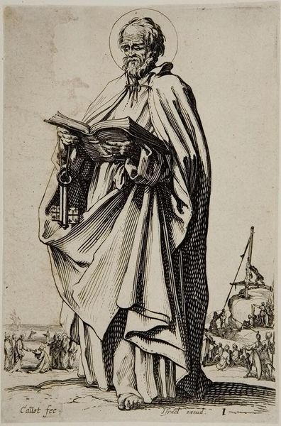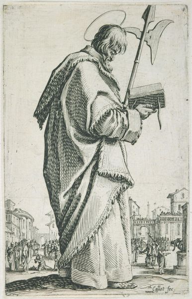 Curator: Here we have Jacques Callot's etching, "Saint Thaddeus or Saint Jude," a striking image rendered in exquisite detail. Editor: The figure's weathered face and massive cloak, combined with the axe, project an image of both power and weariness, a really compelling duality. Curator: Callot, who lived from 1592 to 1635, was a master of etching, and this piece, part of the Harvard Art Museums collection, really shows his mastery. The halo indicates religious iconography and the axe is a symbol of martyrdom. Editor: The axe, a symbol of Jude's martyrdom, dominates the composition. It's a brutal object juxtaposed with the saint's otherwise gentle demeanor. The violence is a memory. Curator: Right, and note how Callot places the saint above a scene of chaos, perhaps depicting the very world from which he seeks to offer guidance. The etching suggests a complex interplay between saintly duty and earthly suffering. Editor: Yes, a somber reflection on the burdens of faith, and the price sometimes paid for holding onto it. Curator: Indeed. Callot's work always gives us something to consider about the era in which it was made.