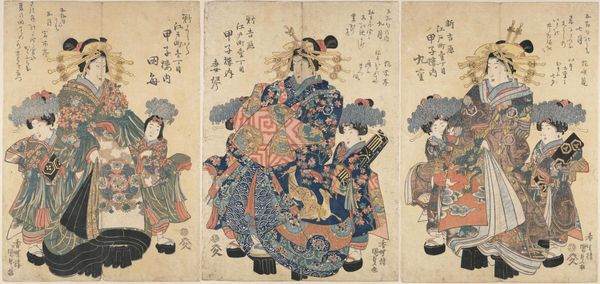Editor: This is Utagawa Kunisada's "Triptych: Courtesans with Kamuro," a Japanese woodblock print. The detail in the garments is amazing! What can you tell me about the role of these figures in society? Curator: Kunisada created this work for a public audience that was fascinated by the glamorous, yet often marginalized, world of courtesans. Prints like this served as both entertainment and a kind of social commentary, influencing perceptions of status and beauty. Did prints such as these reinforce social order, or were they a challenge to it? Editor: That's a fascinating question. I suppose they were both, reflecting and shaping public opinion. Thank you! Curator: Indeed, and thinking about that tension is key to understanding their historical significance.