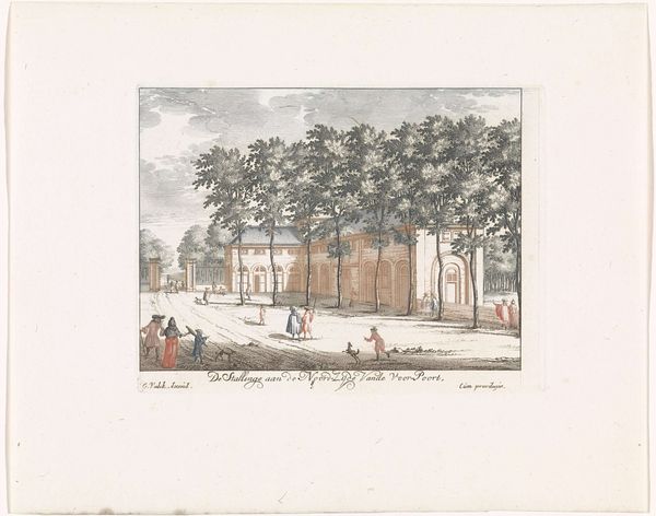 Editor: This is "Gezicht op The Mall in het Saint James's Park te Londen," an 18th-century print by Paquier. The figures are small and somewhat stiff, and that gives the overall scene a rather formal feel. How would you interpret this work? Curator: Consider the way figures populate the Mall; these aren't just people strolling, but carefully placed markers within a symbolic landscape. Note the guard at the left, and the elegantly dressed couple foregrounded, as if performing for us. Does that strike you as staged? Editor: Definitely, especially that guard. He’s almost like a statue. The whole scene feels a bit…unreal. Curator: Exactly. Now think about the trees. They are not just decorative. What do you feel they communicate? Editor: Protection? The elite class enjoying some leisure, safe and sound? Curator: That's one way to interpret. Perhaps, even a sense of ordered continuity, reinforcing the social structure mirrored by the people populating the park, and a legacy continued through each carefully positioned figure. This park almost a theatre…for power. Don't you think? Editor: I never thought about it that way, about the composition serving such purpose! Seeing those recurring figures gives a new meaning now. Almost oppressive… Curator: And doesn’t it alter how we view the print today, aware as we are of the hierarchies and class differences represented here? Images can really condense and convey such complex ideologies! Editor: Absolutely, it's like this seemingly pleasant walk hides a lot about power. Curator: Which invites us to confront our memory about the period, the nostalgia, and our own comfort within the scene itself.