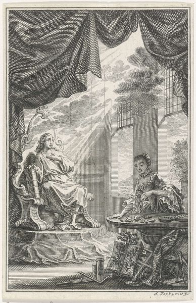 Simon Fokke created this print, "Writer Surrounded by Allegorical Figures," in 1749. The composition presents a tableau vivant of figures within a lush, theatrical landscape, rendered through fine, deliberate lines. The density of the engraving creates a chiaroscuro effect, with the lightest areas emphasizing key figures. The writer at the center is structurally supported by the figures surrounding him. The angel with the trumpet is diagonally above, drawing the viewer's eye upward, while the putti below add a sense of levity, grounding the ethereal scene. Each element contributes to a balanced, yet dynamic, composition. The linear precision of the engraving invites a semiotic reading. The figures, drapery, and flora become signs within a codified system. The writer, flanked by allegorical figures, does not merely depict a scene but constructs an argument about the sources and conduits of creativity. Ultimately, this is a dialogue about the interplay between inspiration and earthly endeavor.