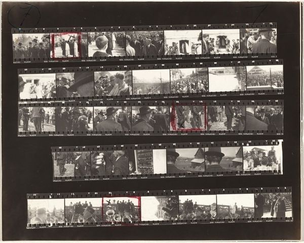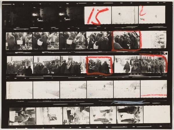 Robert Frank made this photogram, Election day--Switzerland 3, by placing strips of film directly onto light-sensitive paper. It’s a simple method, but the results feel raw and immediate. The photogram includes multiple frames, each a glimpse into a specific moment, almost like frames of thought. The light passes through the film, creating a range of gray tones from solid black to almost translucent. This creates depth through layering, which makes the images come alive. I'm especially drawn to one area where Frank has outlined a group of people, emphasizing their presence within the larger scene. This makes me think about the way art can isolate a detail, prompting a closer look at what might otherwise be overlooked. Frank's approach reminds me a bit of what Moholy-Nagy was doing with photograms back in the Bauhaus, embracing chance and direct contact. It’s like he’s saying, "Here’s how I see it, but it's up for grabs."