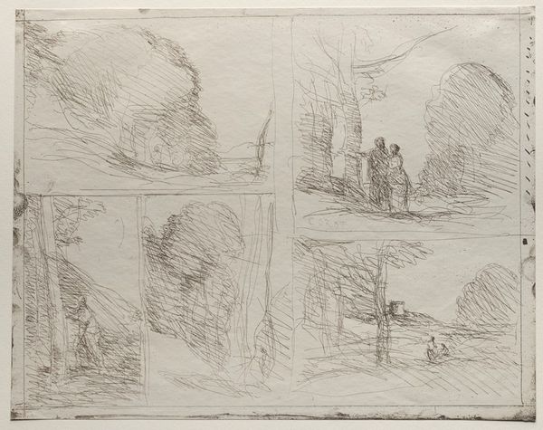 Editor: Here we have Washington Allston's "Two Sketches of a Ship at Sea, for 'Ship in a Squall'," a graphite work. The paper itself seems so delicate. How does the medium contribute to the reading of this work? Curator: The rapid graphite marks tell us about the immediate, physical act of sketching, a direct record of the artist wrestling with representing a squall. Consider how this process, driven by material constraints and the need for speed, informs the final "Ship in a Squall." Editor: So, it's less about the final image and more about the artist's process? Curator: Precisely. It reveals Allston’s engagement with the materiality of art-making, and offers insight into the labor that underlies even seemingly spontaneous depictions of nature. We see the decisions that shaped his vision. Editor: That really changes how I view sketches; it's fascinating to think about the labor involved. Curator: Indeed, it underscores the importance of considering the means of production in understanding art.