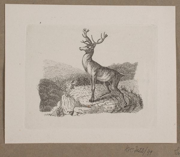 Editor: So this is "Liggende hjort" – or "Reclining Deer" – made in 1841 by Georg Emil Libert. It’s a drawing and engraving, pretty understated. There’s something peaceful and melancholic about the deer’s posture…almost like it's posing. How would you interpret this work? Curator: That air of melancholic nobility is a good starting point. Think about the deer itself. Throughout history, across cultures, it’s carried powerful symbolic weight. It is about vulnerability and strength, instinct and awareness. Here, what kind of associations does the deer conjure for you, especially in the context of 1841 Denmark? Editor: Well, seeing as it's a landscape, perhaps it speaks to Denmark's relationship with nature. Maybe it evokes a Romantic appreciation of the wild? I guess the deer could be a stand-in for something... but what? Curator: Precisely. What national characteristics or anxieties could be projected onto this animal? Think of Romanticism's focus on national identity, and how animals were often deployed as emblems of a nation's spirit or character. This image has this slightly haunting effect, achieved through line and subtle shading, that captures a yearning, and a deep introspection about place, time and belonging. The artist leaves clues in the careful rendering, almost as if trying to immortalize this animal – this symbol. Editor: It's amazing how much complexity lies beneath this seemingly simple sketch. The animal as an emblem – I hadn't thought of it that way. Curator: Symbols evolve, and the artist is shaping, reshaping and recording them. Perhaps next time you see an animal in a landscape you will think of this piece. Editor: I definitely will. Thanks for pointing out how symbols influence our reading of this seemingly tranquil animal portrait.