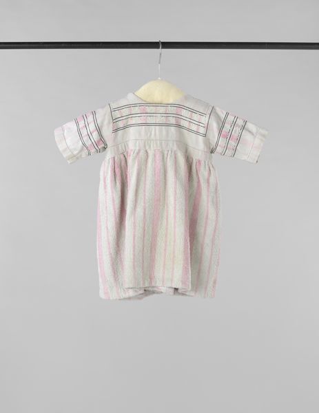 Curator: At first glance, I see purity. The simple design, the stark whiteness... it's very striking. Editor: Well, let's unpack that a bit. This object is a "Kindernachtjapon van wit katoen," a child's nightgown made of white cotton, dating back to sometime between 1888 and 1894. Part of the Glas collection. Curator: So, late 19th century. The context is crucial. This wasn't just clothing, it was a statement. White fabric indicated an ability to keep clean. Editor: Precisely, and that speaks volumes about the socio-economic status of the wearer. Think about the labor involved. Not only the cotton cultivation, processing, the weaving but then keeping it this brilliant white in an era where cleaning wasn't a simple chore. Curator: Right! Laundry was a major undertaking. So, to have a child’s garment like this consistently pristine spoke of privilege and leisure, the family’s wealth literally on display in the bedroom. Editor: It also points to changing ideas around childhood. Affluence allowed for greater focus on children and their needs, even for sleepwear. The detail along the collar—lace, it looks like?—that’s handwork, skill and time lavished on a garment made for private hours. Curator: Indeed. Consider the construction—the precise pleating on the bodice, the cuffs, it speaks of skilled labor. Were these commercially made? Or created in the home or made by a local seamstress? Those questions reflect different dynamics within the community. Editor: It would be interesting to investigate. This object isn't just pretty fabric, it’s a testament to the lives, labor, and social values woven into the very fibers of a seemingly simple garment. Curator: It really challenges our contemporary idea of "basics", doesn't it? There is a deep history embodied here. Editor: Absolutely, the gown's material life helps us understand both intimate histories and a wider history of industrial labor, domestic expectations, and material cultures of the period.