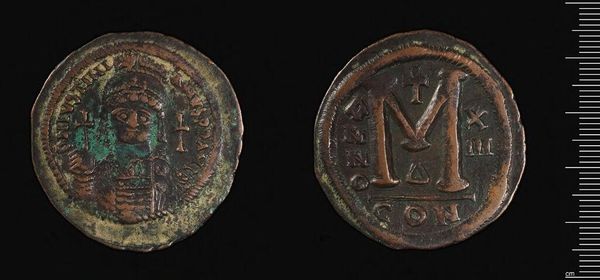 Curator: The weight of this Follis of Anastasios I, nearly 10 grams, hints at an empire's grasp. What strikes you first? Editor: The contrast, ironically. Even in this state of age, the symbols are so clearly defined against a pitted surface; the details are quite striking. Curator: Indeed. Coins like this, minted under Anastasios around the 5th century, weren't just currency. They represented Byzantine power, influencing economic structures and social hierarchies. The images conveyed political messaging. Editor: And that messaging relies heavily on the symbolic language. The emperor’s profile, the cross, the prominent "M"... Each element carefully considered to convey authority and stability. Curator: Absolutely. This wasn’t just about facilitating trade, it was about shaping perceptions of imperial rule. Even today, these objects tell us about the relationship between power and representation. Editor: I agree, and looking at how these formal elements intersect with its history really helps to focus my understanding of the piece. Curator: I hadn't thought of it that way; food for thought.